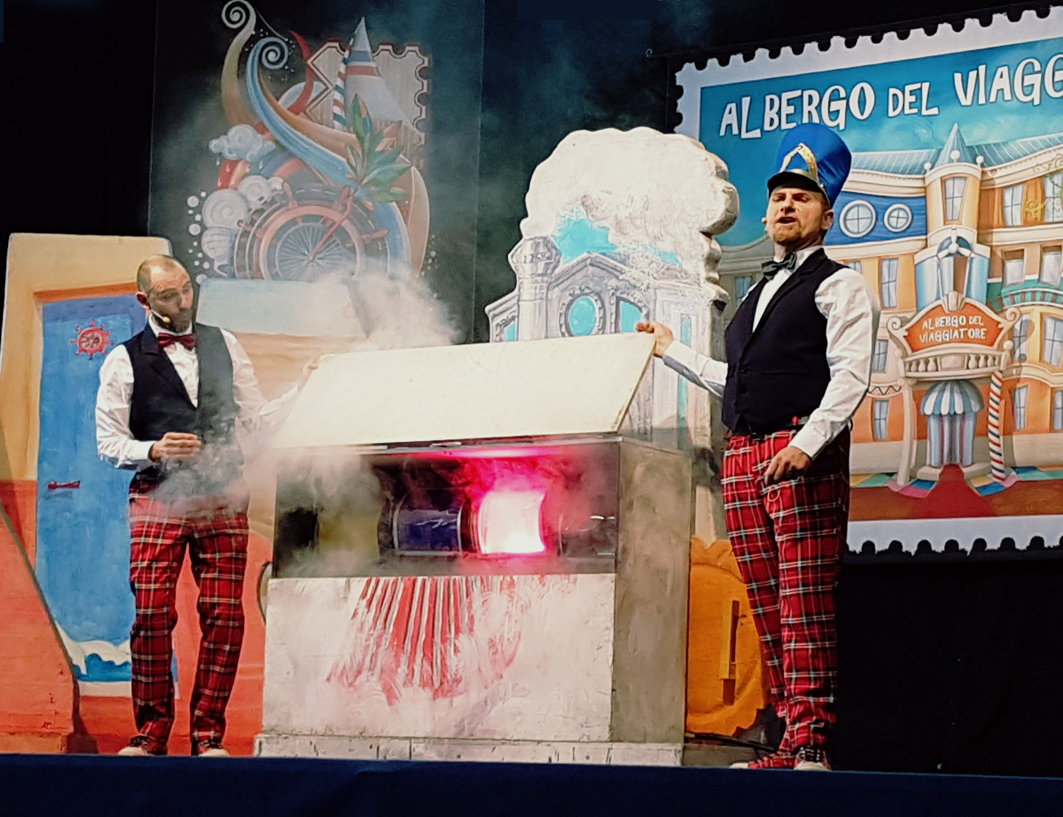 Nello spettacolo, costruito con il pubblico, si percorrono chilometri immaginari, si attraversano confini, si superano limiti, si conquistano mete e traguardi. La vicenda prende il via dall’ALBERGO DEL VIAGGIATORE, dove il sig. ULISSE ed il sig. CRISTOFORO, i due buffi ed intraprendenti custodi dell’Albergo, raccontano di viaggi e viaggiatori. Ciò che contraddistingue questo albergo sono le grandi PORTE: “…Ogni porta è diversa dall’altra, ogni porta conduce in una stanza diversa dall’altra ed ogni volta che un viaggiatore, dopo aver compiuto un viaggio si ferma all’albergo, quasi per magia l’albergo del Viaggiatore diventa più grande, si aggiunge una nuova stanza diversa dalle altre e con una porta, chiaramente, diversa dalle altre, perché ogni viaggio è sempre diverso da un altro!”